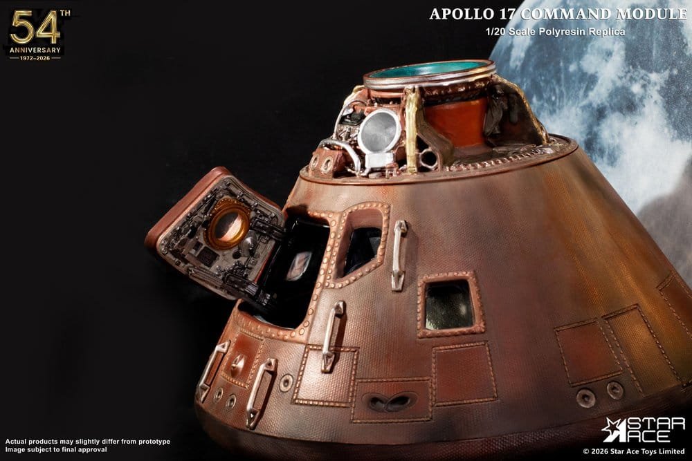 Mark the 54th anniversary of the last Moon landing with Star Ace’s masterfully detailed Apollo 17 Command Module replica. Explore the pinnacle of human achievement with this meticulously designed polyresin replica crafted at 1/20 scale. Measuring 20cm in diameter, this intricately crafted model features a fully detailed interior and exterior, capturing the essence of the historic mission commanded by Gene Cernan and representing the last time humanity visited the moon. Mounted on a clear base with the full moon behind it, the module appears to be orbiting the moon one last time. The base also features a display plaque bearing the official NASA and Apollo 17 mission insignia. This is a definitive piece for serious collectors and space history aficionados and a stunning tribute to the Apollo 17 mission.