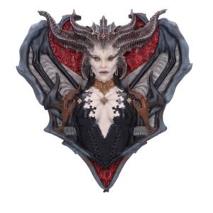 “Unveil the dark allure of the Officially Licensed Diablo® IV Lilith Wall Plaque. This highly detailed piece brings to life Lilith, the daughter of Mephisto and sister of Lucion, known throughout Sanctuary as the Queen of the Succubi. Captured in her demonic splendor, Lilith is depicted with her hauntingly feminine features, quills replacing hair down her back, and a tail ending in fearsome barbs.