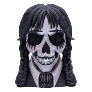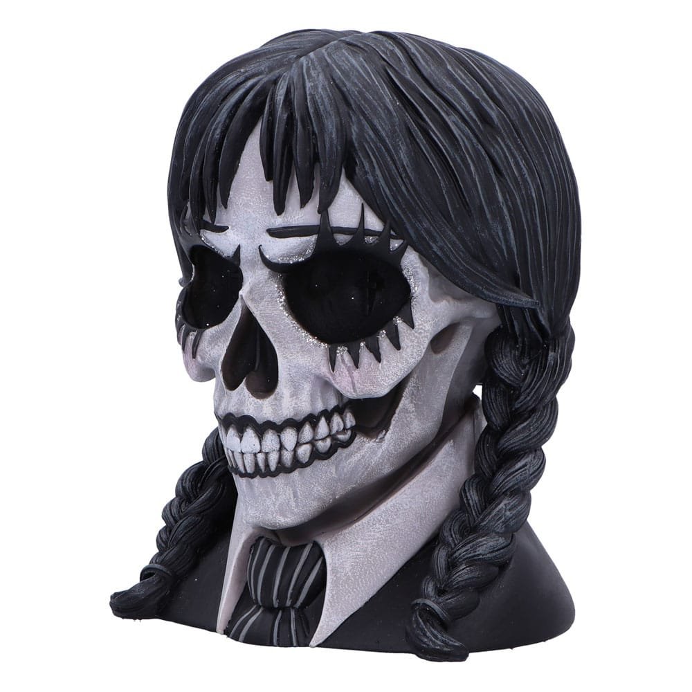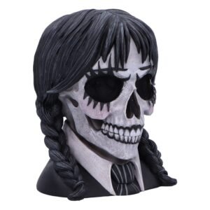 Dark Glare is a gothic school girl-inspired skull, masterfully designed by Nemesis Now. This hauntingly beautiful piece is cast in the finest resin, showcasing intricate details that blend dark, eerie aesthetics with the innocence of a school uniform. The skull is hand-painted and adorned with black and white attire, while plaited black hair cascades down, adding a touch of gothic charm. Glitter accents around the eyes offer a captivating contrast, creating a mesmerizing, otherworldly gaze.