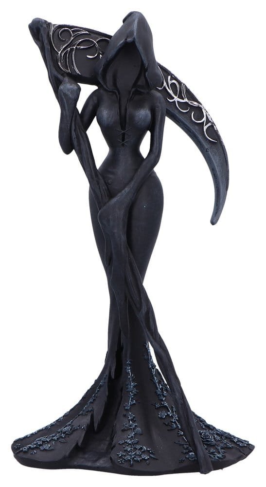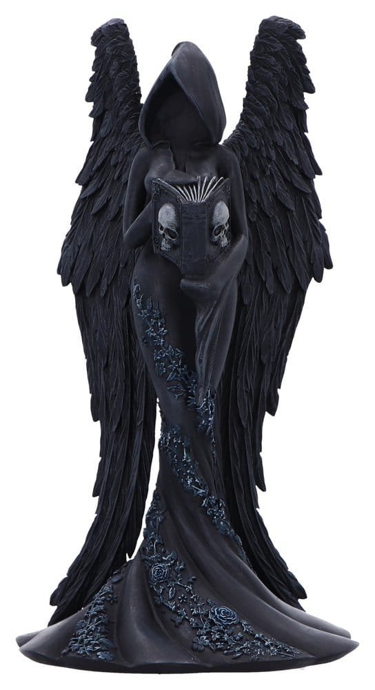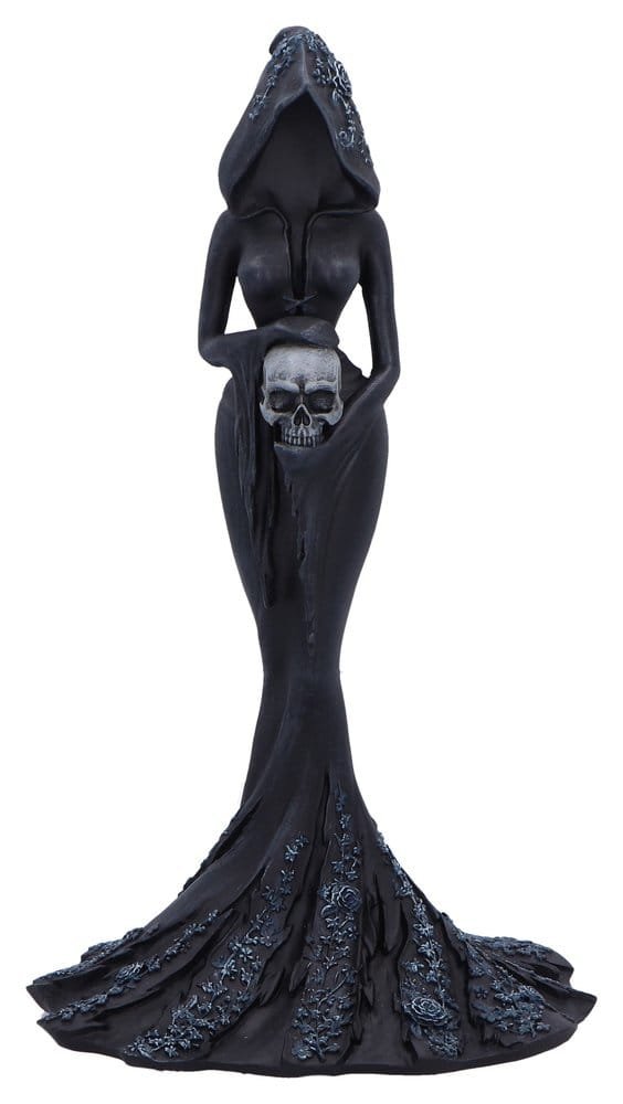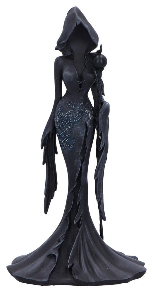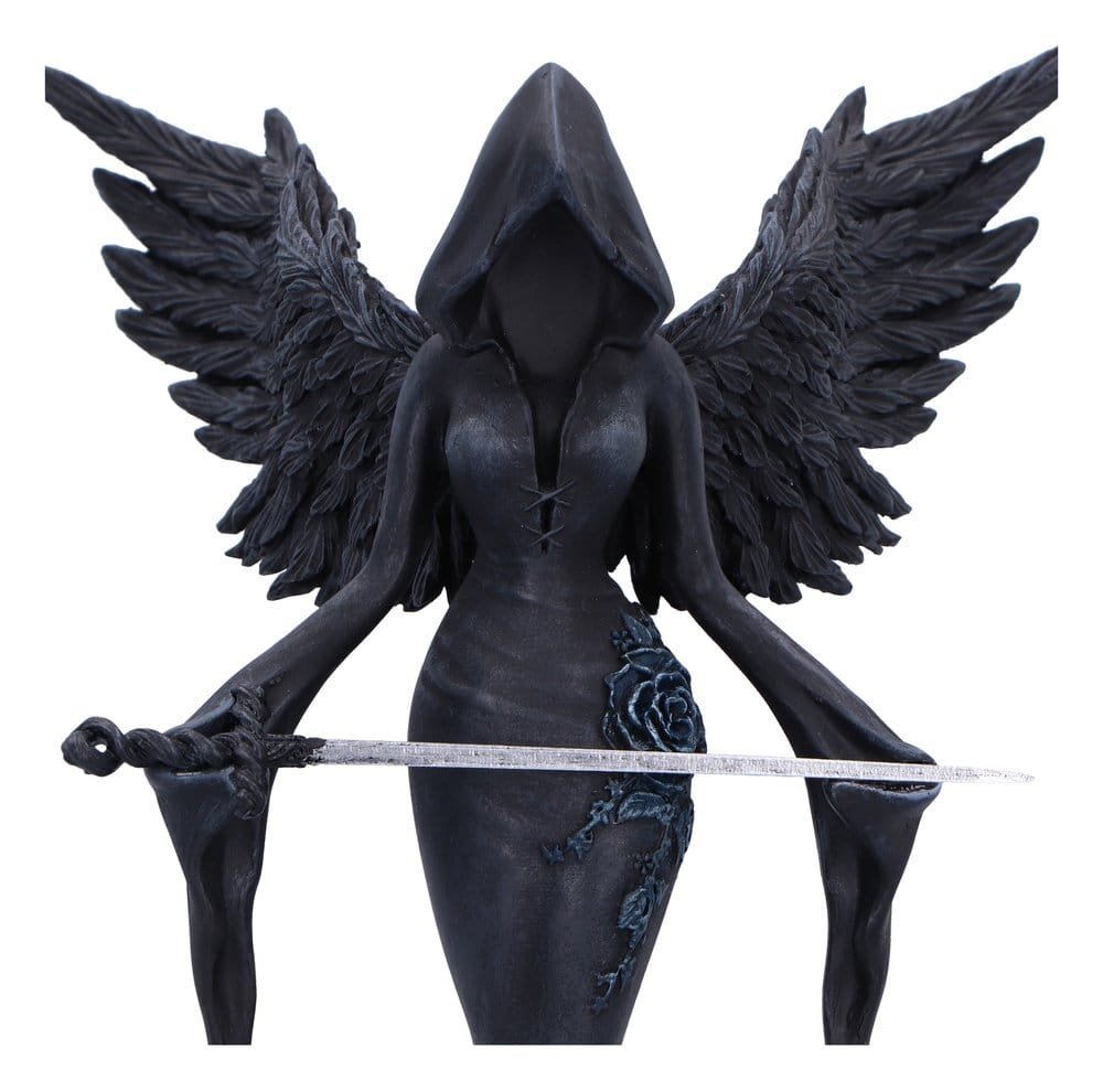 A gothic figurine designed by Nemesis Now, capturing a powerful and enigmatic feminine presence. The figurine depicts a faceless, hooded woman with angel wings, matte black hand-painted robes adorned with sculpted flower accents, and a commanding sword. Packaged in a secure and stylish branded window box, ideal for display or gifting. Perfect for fans of dark fantasy, gothic home decor enthusiasts, and collectors of unique mystical figurines.