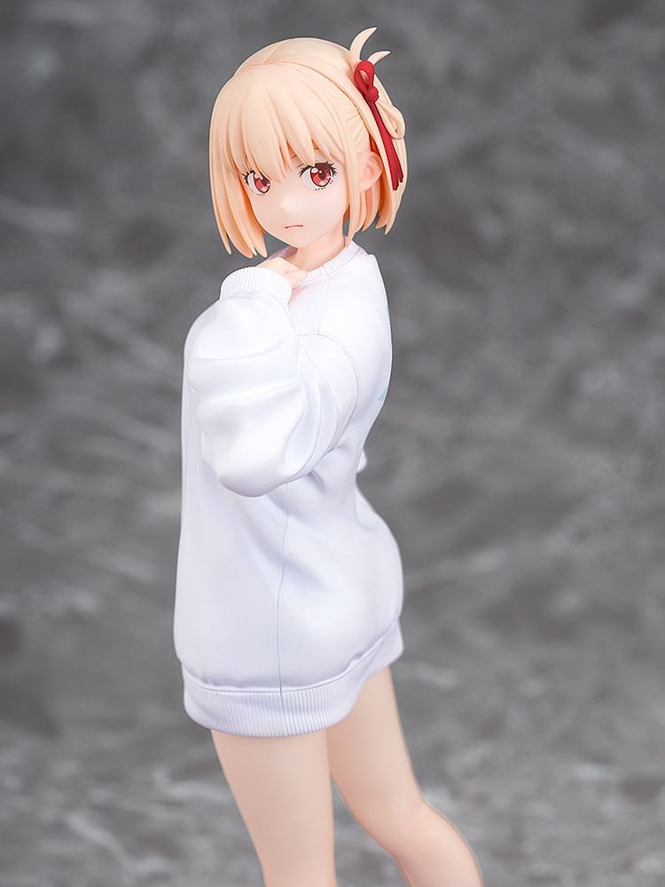 From the anime “Lyoris Recoil” comes a 1/7 scale figure of Chisato Nishikigi! The figure is based on the eyecatch illustration from the second episode, and features Chisato wearing an oversized sweatshirt while baring her legs. The figure also comes with an interchangeable smiling face part, allowing for a different display option. Be sure to display her with Takina Inoue: Oversized Sweatshirt Ver. (sold separately), also up for preorder!