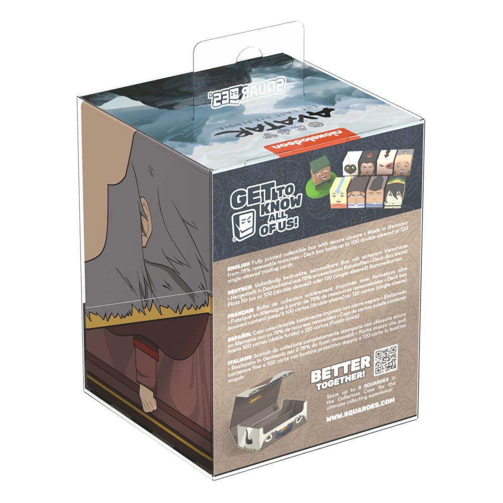 Collectible box for storing TCG decks, tabletop gaming accessories, and/or collectibles. The Iroh Squaroe from the Avatar: The Last Airbender™ edition holds up to 100 cards in double protective sleeves if used as a deck box. Squaroes are made from 78% renewable recources and fit perfectly into the separately available Collectors Case.