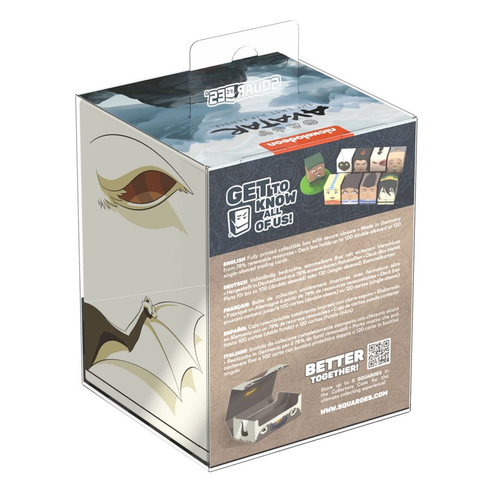 Collectible box for storing TCG decks, tabletop gaming accessories, and/or collectibles. The Momo Squaroe from the Avatar: The Last Airbender™ edition holds up to 100 cards in double protective sleeves if used as a deck box. Squaroes are made from 78% renewable recources and fit perfectly into the separately available Collectors Case.