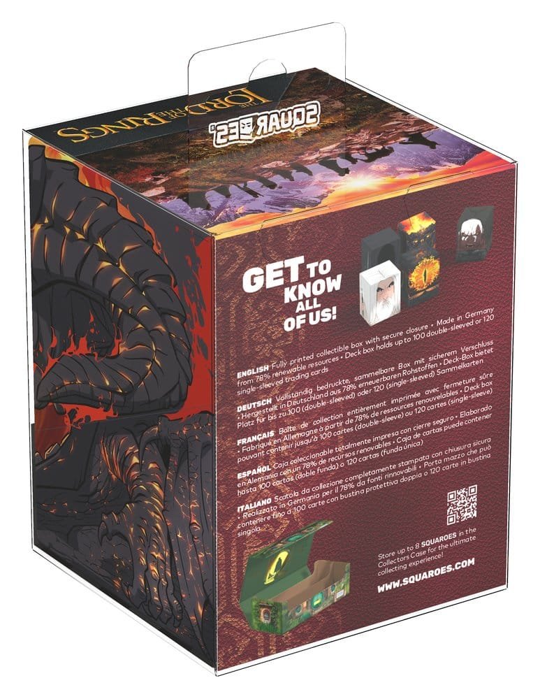 Squaroes by Ultimate Guard are the next generation of TCG gaming accessories! Crafted from high-quality, 78% sustainable materials they combine outstanding card protection with collectibility through exclusive designs, limited one-off printings, and deck boxes available in varying rarities. The The Lord of the Rings Squaroes hold up to 100 standard- or Japanese-sized trading cards (from games like Magic: The Gathering, Pokémon, Lorcana, Flesh and Blood, Yu-Gi-Oh!, Riftbound, and One Piece) in double protective sleeves*. As a new spin on Ultimate Guard’s fan-favorite Boulder deck box, Squaroes offer an ultra-sturdy case with a secure closure, while staying easy and convenient to open.