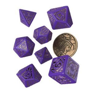 Inspired by The Witcher franchise, this dice set is dedicated to Yennefer of Vengerberg – a powerful sorceress. The set contains 8 pieces; 7 polyhedral dice, and a metal coin featuring Yennefer’s depiction, which acts as a D2. Each die is painted in the image of a starry night sky with turquoise engravings. The highest value faces and coin reverse share imagery with Yen’s pendant.