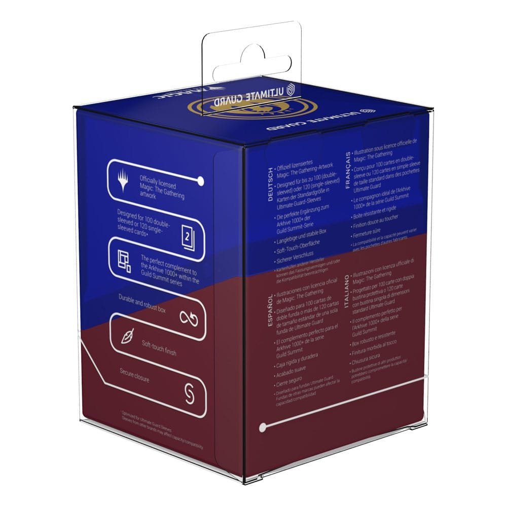 Ultimate Guard celebrates one of the most iconic and popular planes in Magic: The Gathering’s history with the “Guild Summit” series: Ten elegant Boulder 100+ featuring the golden crest of each guild on the semi-transparent deck boxes, all with a silky soft-touch finish. The Boulder 100+ holds up to 100 double-sleeved cards, making it the perfect home for your two-color Commander deck! Don’t miss out on the stunning Arkhive 1000+ Xenoskin from the “Guild Summit” series either, which is the perfect storage place for up to ten Boulder 100+.