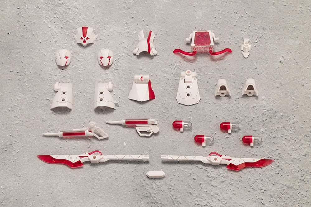 Includes syringe-like weapons that are able to be connected to the hardpoints of the marionnette style forearms. Unfolding the grips allow them to be used as handheld weapons.