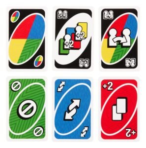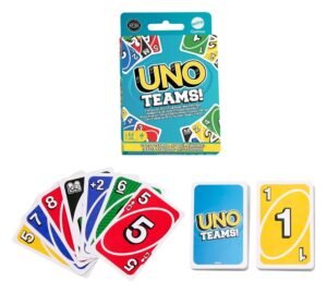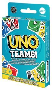 UNO Teams offers a new way to play the classic game. Players still have to find matching colours, numbers and symbols. Instead of playing against each other, they play in teams of two and try to win together. Special cards and rules make it easier for team members to work together. However, both players must discard all the cards in their hands to win. Don’t forget: when a player (or their partner) has only one card left, shout “UNO”!