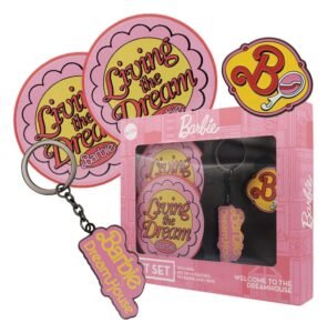 Este conjunto de presente é perfeito para a fã da Barbie na sua vida. Composto por um lindo broche da Barbie em metal, um chaveiro da Barbie também em metal e um porta-copos da Barbie com base antiderrapante de cortiça, o conjunto de alta qualidade vem em uma caixa de apresentação e é todo rosa!
