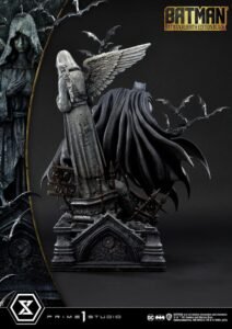 Standing atop the ruins of Gotham Cemetery, this 28-inch-tall Batman statue embodies the hero’s brooding presence and relentless spirit. Batman is captured in a powerful yet dynamic pose, his muscular physique meticulously sculpted to showcase every sinew and contour that defines his strength and agility. Ready to leap into action, his left fist grabs at his voluminous cape as it billows around him, its scalloped edge resembling bat wings caught in an unseen wind. The base features intricately crafted concrete blocks, weathered and worn, hinting at the passage of time. An angel statue looms behind the Caped Crusader, its serene yet somber presence adding a haunting beauty to the scene.