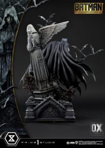 Standing atop the ruins of Gotham Cemetery, this 28-inch-tall Batman statue embodies the hero’s brooding presence and relentless spirit. Batman is captured in a powerful yet dynamic pose, his muscular physique meticulously sculpted to showcase every sinew and contour that defines his strength and agility. Ready to leap into action, his left fist grabs at his voluminous cape as it billows around him, its scalloped edge resembling bat wings caught in an unseen wind. The base features intricately crafted concrete blocks, weathered and worn, hinting at the passage of time. An angel statue looms behind the Caped Crusader, its serene yet somber presence adding a haunting beauty to the scene.