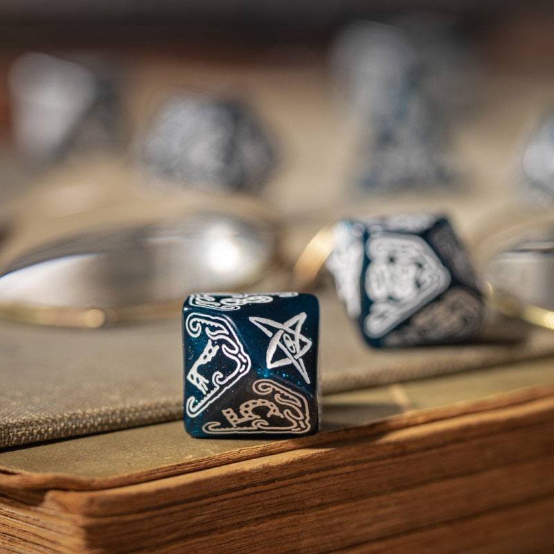Q WORKSHOP presents The Call of Cthulhu Abyssal & white Dice Set. Made from the best material, these dice are dark blue like the deep ocean, where small beings mix with the floating dust. Digits are bright white for legibility, like a streak of light hurting your eyes in the darkness. The highest face is adorned with the Elder Sign, ideal for disturbing Lovecraftian setting.