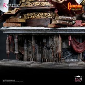 Inspired by Ayami Kojima’s vision of the character, Alucard manifests from a trail of mist, wielding a holy rosary in one hand and his blade in the other as he cuts down the undead enemies lurking the library’s halls. A vampire bat soars from Alucard’s billowing cloak while a wolf’s head adorns the base behind him, representing the dhampir’s animal transformations. Beneath Alucard’s levitating form, Richter Belmont cracks the famed whip, Vampire Killer, against a skull-headed Spellbook and Lesser Demon. The golden, gothic splendor of the library’s furnishings feature layers of intricate paintwork and authentic, gilded details. Hiding in the wreckage of the battlefield, countless relics surround the crimson-carpeted stairway-a vial of Holy Water, ornate candelabras, over two dozen ancient volumes, a discarded blade, and a ceremonial Stone Mask. Cast in shadow, the silhouette of the statue invokes a similar shape to Dracula’s Castle, with Alucard’s upheld sword, the bat’s wing, and the monster’s arms serving as allusions of its towers and spires.