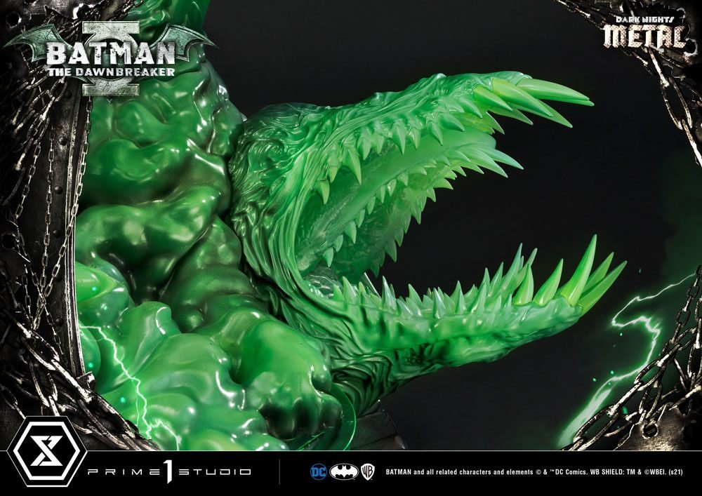 Prime 1 Studio’s The Dawnbreaker statue is poised to mete out his dark justice, floating in at 35 inches tall! The statue is a callback to Jason Fabok’s impressive Batman: The Dawnbreaker #1 cover, with its dark green energy, seething out from under Earth -32’s Bruce Wayne. The Dawnbreaker’s paint application boasts impressively vibrant, metallic green accents. The textural, and meticulously detailed sculpting of his costume only serves to enhance his terrifying visage. His base comes alive with horrifying constructs only a Dark Knight of Barbatos can conjure up. The Dawnbreaker’s dark-energy creatures are made of translucent green resin, with airbrushed highlights and shadows to accentuate the fearful forms.