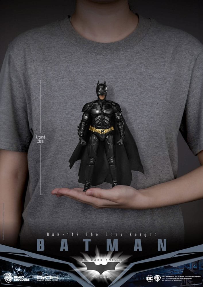 Beast Kingdom is proud to unveil the latest in its acclaimed DAH (Dynamic 8ction Heroes) series-DAH-119 Batman (The Dark Knight). This figure features an intricately crafted head sculpt, capturing the exact likeness of Christian Bale as Batman. The modernized armored suit is faithfully recreated with meticulous attention to detail, highlighting the bat emblem and defined musculature. The classic black cape, made from premium fabric, enhances the figure’s dimensionality. With over 22 points of articulation, this figure allows collectors to pose Batman in iconic stances from the film, making it an essential addition to any collection.
