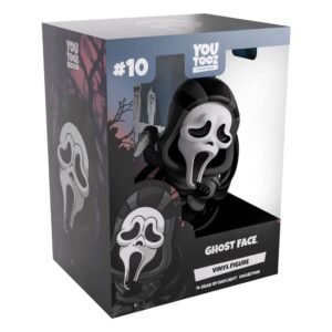 “Do you like scary games?”. Ghost Face has tracked down Youtooz, ready and waiting for his next kill! Sprinting forward at 4.6 inches tall with tendrils of his black cloak flying around him as he raised a knife ready for a final kill, his white Ghost Face mask is framed within the black hood of his cloak to truly emobdy fear. The windowed display box has been illustrated to show Ghost Face peeking around the side of a crumbling brick wall in front of tall grass. While the interior is a black silhouetted forest with a glowing red and blue haze and the white ‘Dead by Daylight’ logo at its back, this grim motif then continues onto the protective sleeve with dark trees surrounding it completely as their figure can be seen through the large clear window at its front. This collectible ships in a matte, embossed, protective outer sleeve and a custom sized plastic protector for maximum protection during shipping.