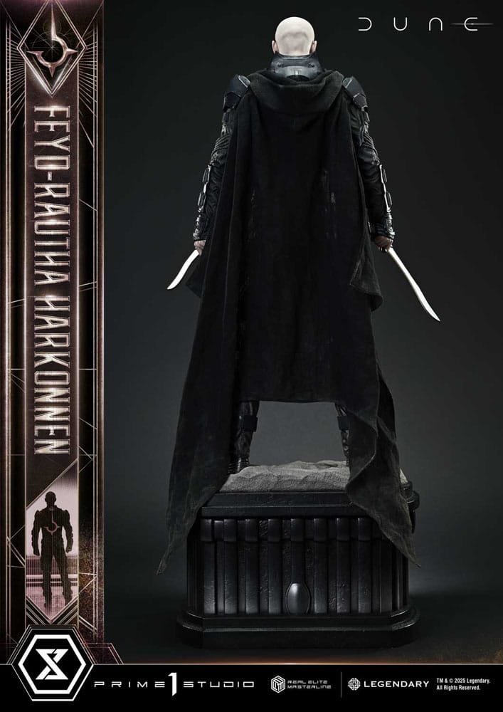 Sunken eyes casting a mysterious shadow, pale skin, and a refined yet unsettling face-this portrait is unmistakably Feyd-Rautha, brought to life with uncanny likeness to Austin Butler, who portrayed him on screen. His black and white blades form sharp edges and graceful curves, while the combat suit is fully recreated down to the worn armor plates and woven fabric textures. The removable cape is made of real fabric, producing natural drape and flow. The base beneath his feet combines the deserts of Arrakis with the emblem of House Harkonnen for a weighty finish.