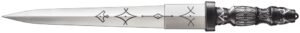 United Cutlery’s Emperor’s Blade replica is an exact reproduction of the actual filming prop used in the Dune films. The 15 1/4″ stainless steel blade (false edged) is engraved in imperial symbols. The cast metal handle is black coated with intricate raised silver decorations, precisely matching the filming prop. This stunning reproduction is displayed on a wood wall display adorned by the sigil of House Harkonnen. A certificate of authenticity is also included with the Emperor’s Blade to assure customers of its value and officially licensed status.