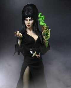 Celebrating 40 years of Elvira, Mistress of the Dark! The devilishly delightful Cassandra Peterson has played the part of Elvira for 40 years with grace, humor and more than a little camp. NECA is proud to present this fiendishly fantastic figure for your horror collection. The 8″ Elvira action figure is fully articulated and features tailored fabric clothing, plus plenty of accessories… alternate winking head, skull, chalice, figure stand, and her signature dagger, which slips into a loop on the belt.