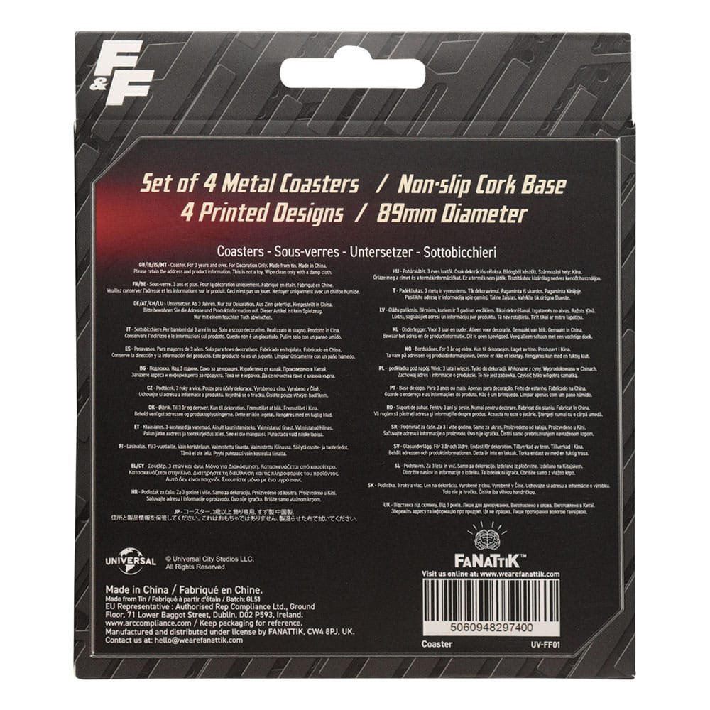 “Don’t let rings put the brakes on your style! Bring some serious street cred to your tabletop with this turbo-charged set of 4 Fast & Furious coasters. Featuring four designs with a vintage finish, each coaster has a metal printed surface and a non-slip cork base for that extra bit of grip.