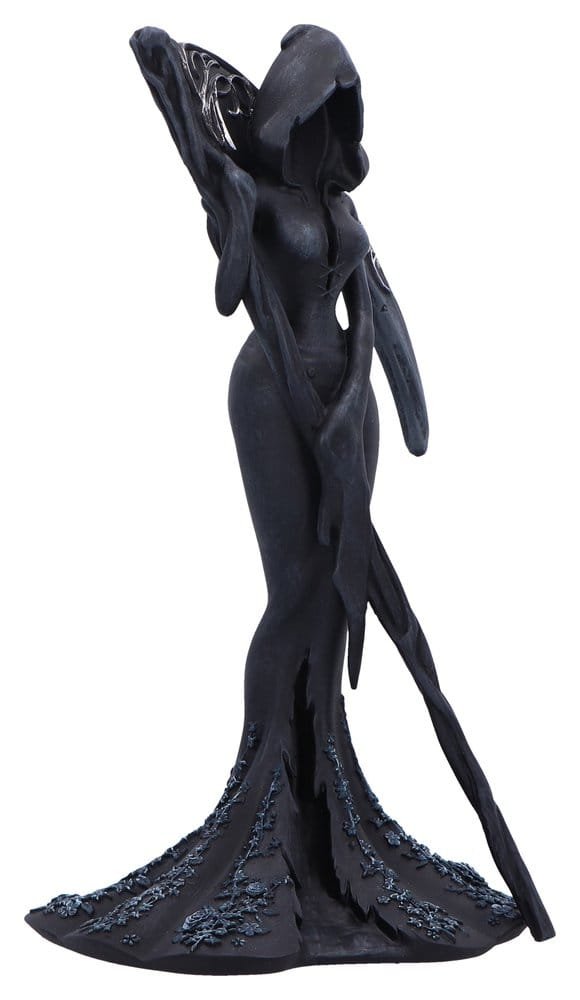A hauntingly elegant figurine depicting a faceless, hooded woman wielding a scythe. A finely sculpted resin body, finished in matte black with a striking scythe, evokes mystery and power. Packaged in a branded window box, ensuring it arrives safely and ready for display or gifting. Great for collectors of gothic decor, fantasy fans, and admirers of dark feminine symbolism.