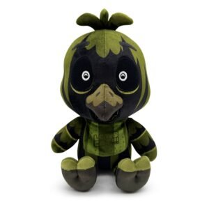 Out of the arcade and into your arms, Phantom Chica’s here and softer than ever! Sitting at 9 inches tall with a pair of bright white pupils shining out from the deep eye sockets of her head, a thin row of internal teeth are hidden behind her pointed beak as a trio of feathers stick out from the top of her head. Colored a deep green and with dark shadows cast across her body, she wears her synonymous ‘Lets Eat!!!’ bib around her neck as taloned feet are kicked forward. This plush is packed to the seams with 100% PP cotton and is made of normal and sublimated minky materials, absolutely perfect for cuddling or hiding in the darkness with!
