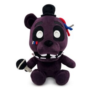 Wait, we swear there was a Freddy there! Where’d he go? Now he’s there! What’s going on?! Sitting at 9 inches tall with white pupils shining out from sunken eyeholes and an open smile full of blocky teeth, a small black tophat rests on his purple head next to a singular round ear. With a series of red, grey and blue wires sticking out from his head, eye and shoulders, a black bowtie and trio of buttons rest on his dark chest as he holds a grey microphone in his right hand. This plush is packed to the seams with 100% PP cotton and is made of the softest minky material with accents of felt, absolutely perfect for cuddling or sneaking around with!