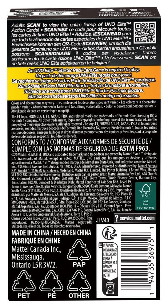Adding the cards from the UNO Elite Formula 1 2025 Core Edition Expansion Set to a UNO Elite Formula 1 card game will speed up the race. Each set contains 3 expansion sets, each with 10 Elite special cards, for a total of 30 cards. Which card will be dealt? Each Elite special card has its own special power that comes into play when a player plays a card with an Elite symbol on it. And of course, players mustn’t forget to shout “UNO!” when they have only one card left in their hand! This racing-themed game is a great gift for all Formula 1 and card game fans aged 7 and up. Colours and designs may vary.