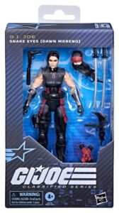 G.I. Joe is a highly skilled, on-demand, special operations force of men and women from around the globe tasked with defending the world from Cobra, a ruthless criminal organization bent on total domination. The brave members of G.I. Joe are prepared to seek out Cobra in any environment on the planet. there’s trouble, G.I. Joe is there. New to the G.I. Joe Classified Series line, Snake Eyes (Dawn Moreno) comes ready for adventure, with multiple points of articulation for high poseability. This Snake Eyes (Dawn Moreno) figure of the fan-favorite A Real American Hero comic book character makes her action figure debut in the G.I. Joe toy line. Snake Eyes (Dawn Moreno)contains 7 character-inspired accessory pieces including alternate masked head, 2 katana swords, twin Saya sheath, and weapon accessories. Rescued as a teen from a bleak life in Cobra. Honed into a ninja master. Inherited Snake Eye’s memories via Brainwave Scanner. Stealthy. Speedy. Deadly. You’d better believe Dawn’s a Joe.