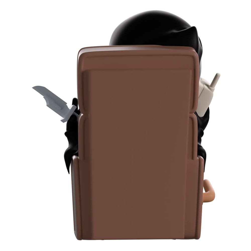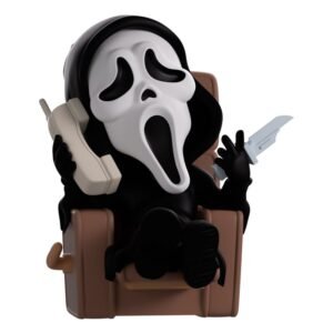 Espera aí, quem está no telefone? E por que estão perguntando sobre voltar para a Youtooz?! Ghost Face está de volta para relaxar, sentado na poltrona marrom mais confortável, com seus 10,4 cm de altura, os pés pendurados na borda do apoio para os pés e um telefone antigo no ouvido. Com um movimento displicente de faca para o lado, usando sua icônica máscara branca com olhos amendoados e boca aberta e alongada, seu corpo está coberto por uma longa capa preta que vai da cabeça até os pés calçados com botas. A parte externa mostra Ghost Face recostado, saboreando alguns petiscos sob a luz de uma tela de TV. Enquanto isso, o interior completamente escuro se quebra com cacos de vidro, revelando sua máscara branca através das sombras. Essa escuridão se estende até a capa protetora, onde sua figura pode ser vista através da grande janela transparente na frente da embalagem. Este item colecionável é enviado em uma capa externa fosca e texturizada, com um protetor de plástico feito sob medida para máxima proteção durante o transporte.