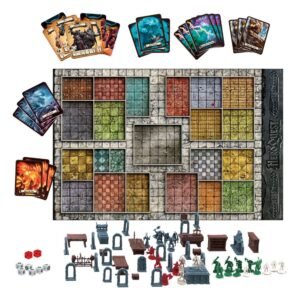 Includes gameboard, 31 monster miniatures, 4 hero miniatures, 15 furniture pieces, 10 skull pieces, 4 plastic rat pieces, 21 dungeon doors, 93 game cards, 4 turn-order cards, cardboard tiles, Quest Book, 4 character cards, Game Master’s screen, pad of character sheets, 6 white combat dice, 2 red dice, and rulebook.