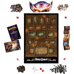 Includes Quest book featuring 10 unique quests, Game System rulebook, Double-sided gameboard, Game Master’s screen, 4 hero miniatures (1 barbarian, 1 dwarf, 1 elf, 1 wizard), 1 dragon miniature, Pad of character sheets, 31 monster pieces, 15 furniture pieces, 41 cardboard tiles, 21 dungeon doors, 102 game cards, 6 combat dice, 2 movement dice, and 52 plastic movers.