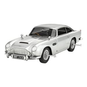 No terceiro filme de James Bond, 'Goldfinger', James Bond dirige pela primeira vez um Aston Martin DB5, equipado com diversos acessórios, como uma antepara blindada extensível à prova de balas, metralhadoras e três placas de matrícula intercambiáveis. – Os acessórios podem ser montados estendidos ou retraídos – Rodas giratórias – Decalques e adesivos. O inovador sistema de encaixe garante uma montagem rápida e eficiente: componentes multicoloridos e fabricados com precisão são conectados de forma estável por meio de um simples encaixe e decorados com adesivos. Kits simples oferecem uma maneira acessível de despertar o interesse de jovens pelo modelismo e estimular suas habilidades criativas.