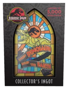 “WHEN DINOSAURS RULED THE EARTH” – the famous banner from the lobby of the Jurassic Park Welcome Center, which falls from the ceiling as the T-Rex roars, having saved the heroes from the attacking raptors, the scene of which is depicted in this limited edition stained glass-style metal ingot. Limited to 5,000 worldwide, the ingot is individually numbered to the reverse and features vibrant colours on the front.