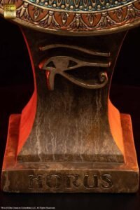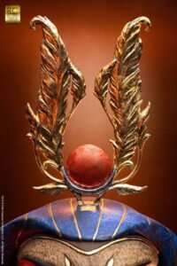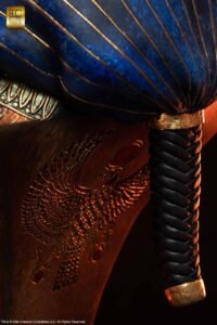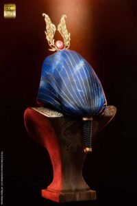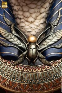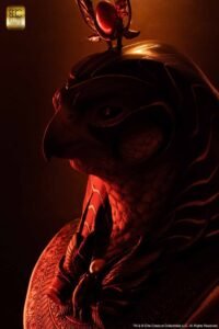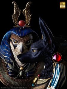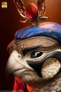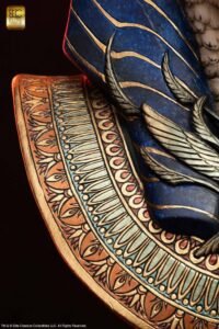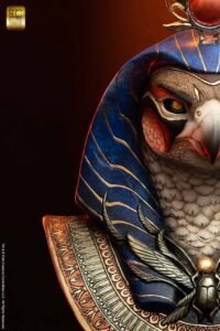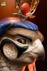 The Horus is the third character designed and created by Miyo Nakamura for ECC’s Myth line, succeeding the ECC Anubis. Here is what Miyo had to say about the process:”Having the opportunity to sculpt Horus was a special moment of synchronicity. As falcons flew above me, I knew I wanted to connect with him next. His hood of Lapis Lazuli represents strength, courage, royalty, and wisdom, which encompasses the characteristics I wanted him to imbue. Being a shapeshifter, he can fly the skies in his falcon form, showing us the importance of having a bird’s-eye view of things. His energy is that of strength and power, yet there is a choice to be gentle and kind. He showed me to be curious about the world through his piercing eyes. To have Horus’s attention, creating space for me and to connect with his energy was the greatest gift he could have given me, teaching me that our presence is our most valuable commodity.