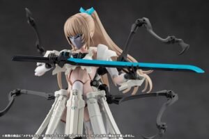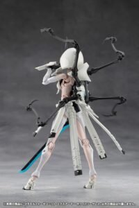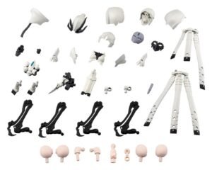 This kit is a color variation kit of Metamorphose Unit Exarmor Sorceress with different molding colors. Exarmor White Sorceress: The hood-type headgear and face-covering skull mask are removable. The base mask behind the skull mask has three eyes, with the third eye sculpted into the forehead. The eyes are movable, and the included tool can be used to adjust the line of sight. The mask can be swapped out for face parts of other female-type Megalomaria or Sousai Shojo Teien characters. The unarmored visor can also be replaced with bangs parts from Sousai Shojo Teien characters. Even with the hood equipped, some characters’ bangs parts can be attached. The bangs parts from Madoka Yuki, Emma Koishikawa, Koyomi Takanashi, Eimi Nijimura, and Short Wig can be equipped. *Not compatible with Ao Gennai and Bukiko Kotobuki’s face and bangs parts. The four extended artificial limbs on the back are movable, and can be extended and retracted. The base is a 4mm ball joint, making it possible to attach female Megalomaria arms to create a six-armed character. The skirt-like pieces of armor are connected with ball joints and have multiple points of articulation, allowing for a wide range of dynamic poses. The extended artificial arms can also be removed and used as a mage’s familiar. Expansion Skin Parts: The expansion skin parts, which have received a large response since their announcement, have also been included to increase compatibility with female-body type plastic model kit series, such as Sousai Shojo Teien. The parts use the pale Skin Color C, which matches well with Sousai Shojo Teien’s Kuon Yakushiji [Maria Kagaribi Costume]. Coloring: The unit features parts in six colors. White (Seeker color), light grey (Mephisto color), grey (Ghillie Dhu color), black (Ghillie Dhu color), clear blue (Emulator color), and pale flesh (Skin Color C).