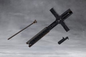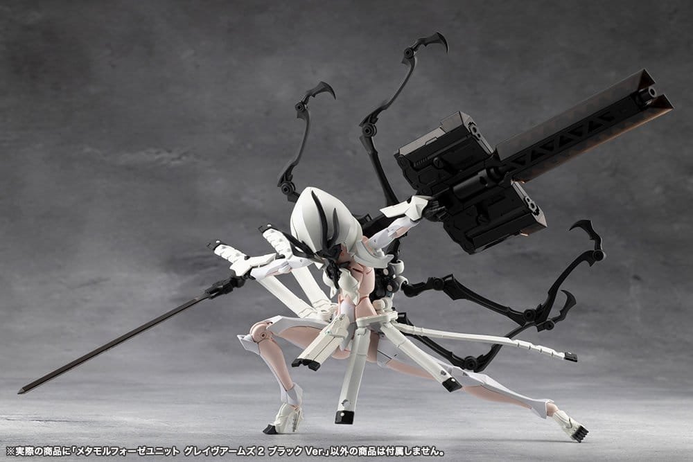 This kit is a color variant of METAMORPHOSE UNIT GRAVE ARMS2 with different molding colors. Grave Arms2 is a combination weapon resembling a cross. While the primary weapon is a giant cannon, it also acts as a large sheath for a laser blade and dual handguns. In addition to transforming into a large sword, the grip can be removed attached to the included effect parts to create a deadly laser blade sure to liven up any heroic action scene. The weapon can also be mounted to various places using the articulated mounting arm. The two handguns can also be detached from the main cannon and used separately. The kit is molded in two colors, black (Ghillie Dhu color) and clear black (Necro Face color).