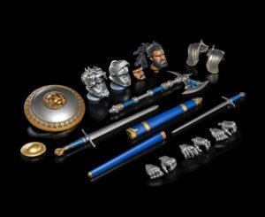 The Legacies of Mythoss: Otho figure comes with a newly sculpted head featuring this warrior’s distinctive look. The set also incudes 2 brand new helmets with flip-down visors, both of which can be used with the Otho “face plate” insert that is also included! As for weapons, Otho v2 comes with a broad sword and scabbard, standard sword and scabbard, a shield with 2 middle inserts (including a Leodysseus lion symbol), and a new battle axe. He also comes with extra hands and premium wired soft goods tunic and skirt.