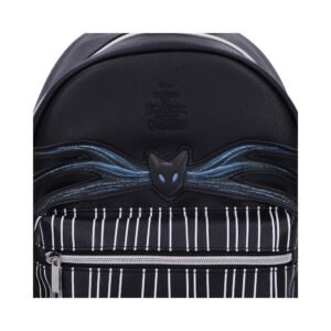It features a sleek black design with bold white pinstripes on the back compartment echoing Jack Skellington’s signature look. The mysterious black cat with striking blue eyes on the back panel adds a unique and haunting detail that fans will instantly recognize and love.