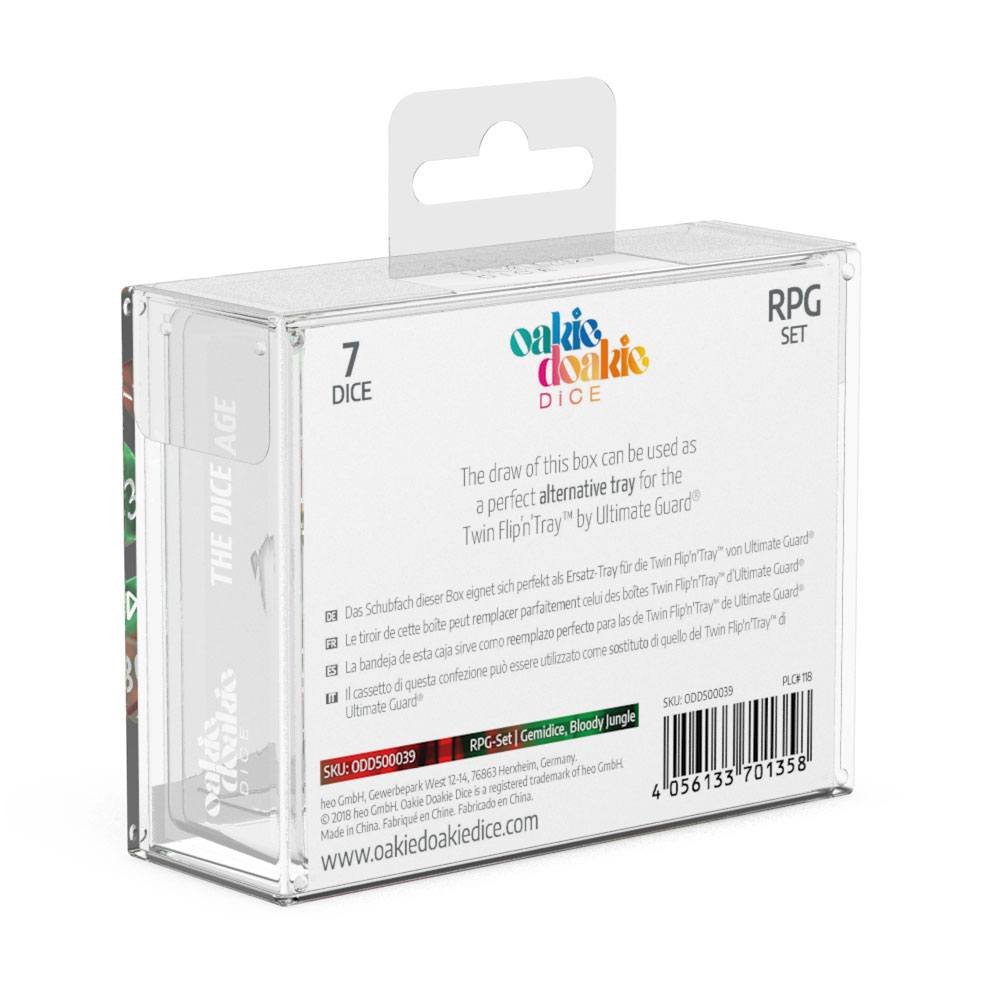 The Role-playing Game Sets consist of 7 different dice: D6, D4, 2x D10 (steps of 1 and steps of 10), D8, D20 and D12. They come packed in strong boxes with extendable shelves so you can easily take them with you and play wherever you want to.