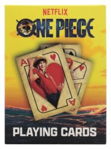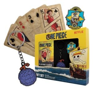“Be ye ready fer some One Piece gifts? This officially licensed One Piece gift set is worthy of the eponymous treasure itself! Comprising a set of One Piece playing cards, a pin badge depicting the Going Merry, and a keyring in the shape of a Gum Gum Fruit, this high-quality set comes in a display box and is an ideal gift for any fan of Netflix’s live action show.