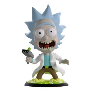 Rick portalled straight into Youtooz to cause some havoc with his debut! Standing at 5 inches tall and brandishing his trusty portal gun in a raised hand as drool seeps out from the manic open smile plastered on his face, a pair of huge round eyes bulge out from underneath a blue unibrow as spiked hair flies wildly to the sides of his balding head. Knee deep in the swirling green portal that bubbles around his feet, a white lab coat flows from his shoulders as he wears a pale blue shirt tucked into brown pants. The exterior of his packaging sees Rick and Morty flying through space. The interior is then covered in green line drawings over a black background which continue onto the protective sleeve where his figure can be seen through the large clear window at the packaging’s front. This collectible was designed in collaboration with the community member @therealracckun, ships in a matte, embossed, protective outer sleeve and a custom-sized plastic protector for maximum protection during shipping.