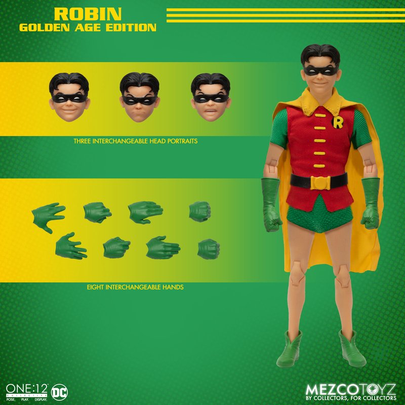 The One:12 Collective Robin: Golden Age Edition wears a tunic with an ‘R’ insignia over his fitted bodysuit, a utility belt, and a cape with an integrated posing wire, capturing his classic comic book appearance. The Boy Wonder comes complete with three head portraits with varying expressions.