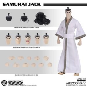 The One:12 Collective Samurai Jack is outfitted in his iconic white gi, geta sandals, a removable hat, and a removable blindfold. 5 head portraits with 3 interchangeable hairstyles allow for a multitude of distinct looks and posing possibilities.