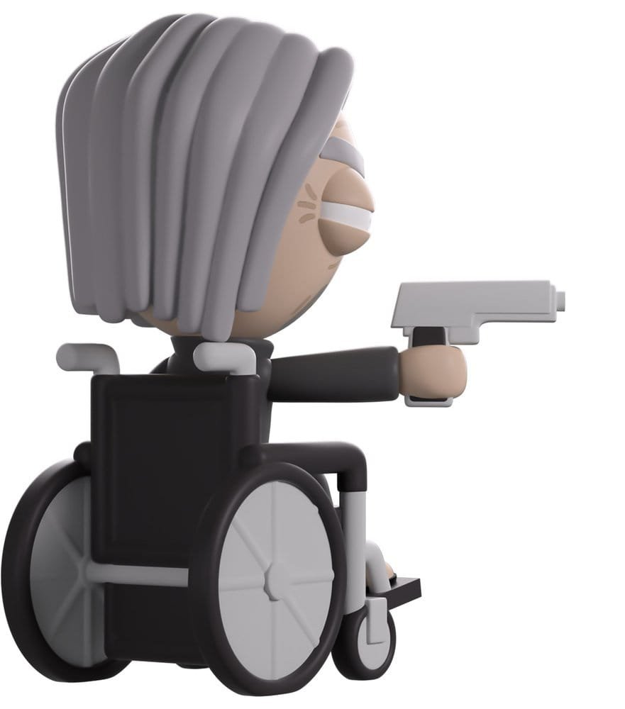 Uncle Nelson’s always got the hook up! And he’s been speaking to his contacts about getting his very own Youtooz figure! Rolling in at 4.4 inches tall and sitting atop a grey and black wheelchair, he squints down the barrel of the grey pistol held in his outstretched right hand as the left grips the chair’s arm. With deep wrinkles covering his face and shoulder-length grey hair that matches a thick goatee, he wears a grey jacket and slacks over a checkered shirt, along with black slides. The exterior sees him looking up from the wooden porch of his ranch, while the interior looks onto a dusty pink desert with a single barren road running over a shaded hill. The protective sleeve is then covered in plants under hazy purple light as his figure can be seen through the large, clear window at the packaging’s front. This collectible ships in a matte, embossed, protective outer sleeve and a custom-sized plastic protector for maximum protection during shipping.