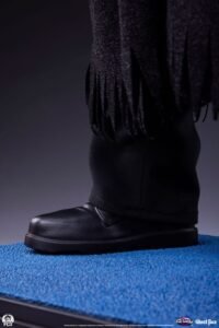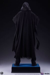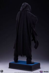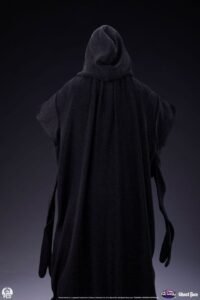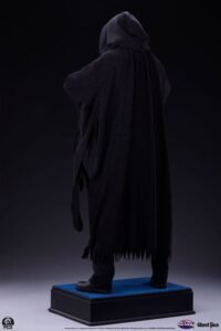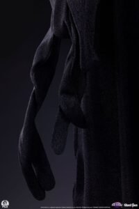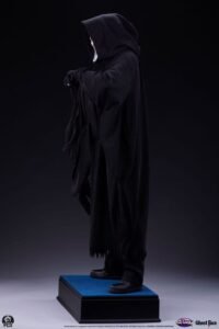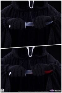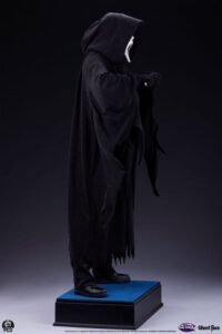 Standing over 38″ tall, this mixed media collectible strikes a menacing pose, standing confidently as the masked killer wipes the blood from the blade of their terrifying knife. The ghostly white mask contrasts starkly against the killers jet black cloak and hood adding additional drama to the masks already haunting appearance. This half scale statue includes a tailor made fabric cloak with screen accurate shimmer effect as well as real fabric trousers for an even greater sense of realism.