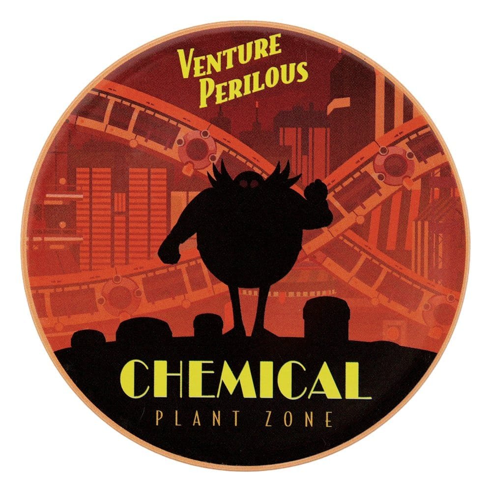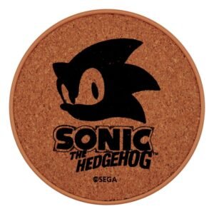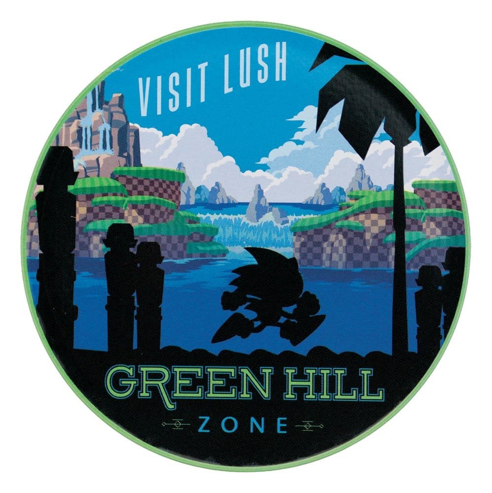 “South Island, Chemical Plant Zone, Labyrinth Zone e, claro, Green Hill: todos locais icônicos do mundo de Sonic the Hedgehog, e todos representados neste conjunto de porta-copos estampados. Feitos de lata com base antiderrapante de cortiça, cada porta-copos mede 89 mm de diâmetro.”.