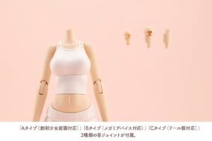 The set includes three types of neck joints: Type A (for SOUSAISHOJOTEIEN), Type B (for Megami Device), and Type C (for regular doll clothes). Type B has a slightly longer neck than Type A to support use with Megami Device heads. Type C has an even longer neck than Type B to prevent it from being hidden under the clothing.