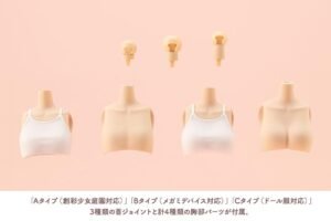 O conjunto inclui três tipos de articulações de pescoço: Tipo A (para SOUSAISHOJOTEIEN), Tipo B (para Megami Device) e Tipo C (para roupas de boneca comuns). O Tipo B possui um pescoço ligeiramente mais longo que o Tipo A para permitir o uso com cabeças Megami Device. O Tipo C possui um pescoço ainda mais longo que o Tipo B para evitar que fique escondido sob a roupa.