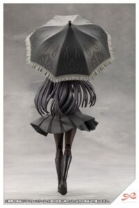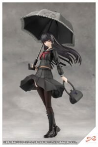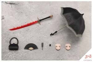 In addition to props with a retro and traditional feel such as the paper parasol, a Japanese bag, and folding fans, the set features a nostalgic flip phone. The exaggerated katana is designed specifically for Kuon to go with her black sailor uniform. The set also includes two new expressions: Pouting and an evil grin. Unpainted versions are also included.